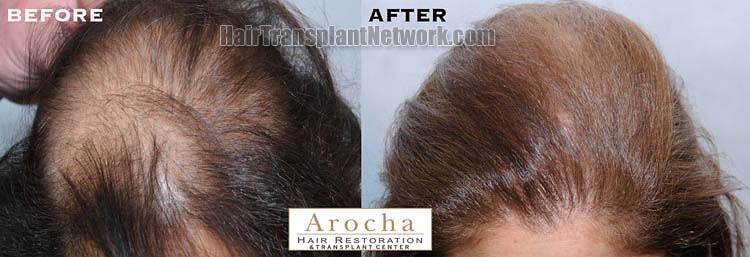 This woman in her 50’s came to Dr. Arocha for her hair restoration options. She wanted to correct her female pattern alopecia hair loss. Hair transplant surgery was performed with 2000 FUT procedure (the crown was not worked on). The results shown are 1 year after her procedure.