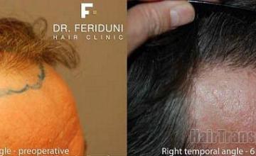 Follicular Unit Hair Transplantation performed on a 44 year old Caucasian male with:- NW Class III class T-P- Donor density of 94-96 FU/cm2- Hair diameter of ~70 micronsTreatment plan:A Follicular Unit Extraction with 2000-2400 FU to reconstruct the hair line and temporal peaks Performed procedure (May 4Th, 2010):A FUE procedure with 2656 FU in a single day session, ‘3 step procedure’, i.e. an intermittent follicular unit extraction (iFUE), with:* 872 single hair FU* 1784 double and triple hair FUExtraction performed with a 0.9mm FUE punch with Versi handle™; No microscopic preparation of the follicular unit grafts;Parallel incisions (single and double units) were made in custom-sized blades technique (~Cutting Edge blades of 0.7mm – 0.9mm).Dr. B. Feriduni