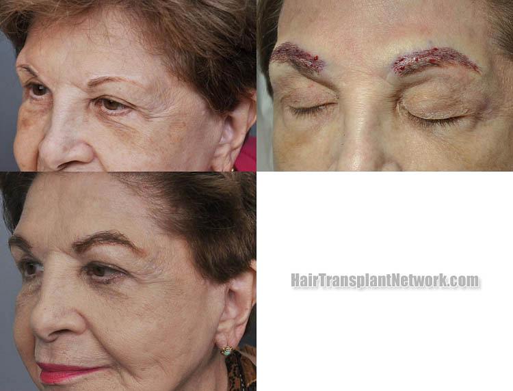 This delightful lady is almost 80 years old and wanted to restore her eyebrows. We did 370 grafts using scalp hair (1-282, 2-88) to both brows. She is shown 6 months later. In the first year, transplanted brows can be a little wiry and have to be trained flat. Of course, they also have to be trimmed periodically because they will grow longer than normal brow hairs.