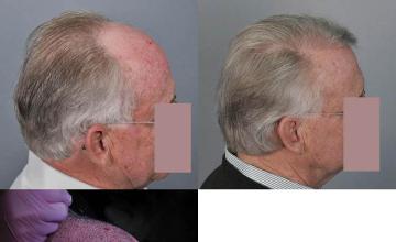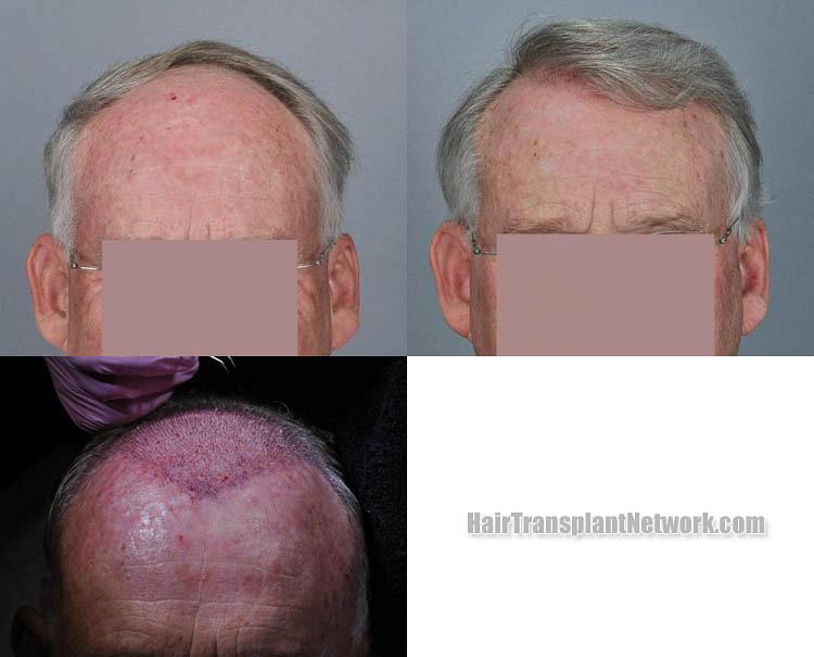 This patient is in his mid 60's and wanted to restore his frontal hair, as well as thicken the crown. We started finasteride and performed FUT: 3,801 grafts (1-779, 2-1626, 3-1010, 4-386; 8,605 hairs), placing mostly in the front but also some in the mid scalp and crown. He is shown 10 months post op. In patients with gray/white hair, we dye the hair to make dissection and placement easier.