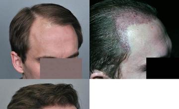This patient is in his early 40's. He had been taking finasteride with good results and no further hair loss. He wanted to primarily restore the front, but also add some to the crown. We performed FUT 4,399 grafts (1-1136, 2-2129, 3-1113, 4-21) to the front, midscalp, and crown. We did not shave his hair, allowing him to return to work in a week. He is shown one year later.