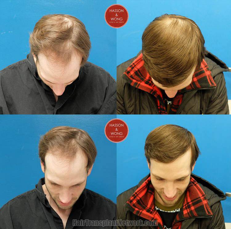 This patient in his mid 30's from Alberta reached out to us via an online consultation in the fall of 2013. In December of the same year he came to the clinic for his procedure.He was taking Propecia at the time of his surgery. Dr. Wong rebuild the hairline and frontal zone blending into the mid scalp with 3550 grafts. Of which 1007 were singles, 2303 doubles, 240 were 3-4 hair grafts.