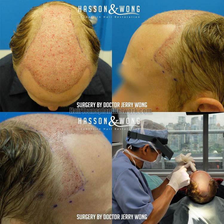 This Vancouver area patient in his mid-30’s was bothered by his receding hairline and also had diffused thinning throughout the top of his scalp extending to parts of his crown to the extent of which may not be clear in the pre-op photos. Once the hair was shaved prior to the procedure, Dr. Wong could get a more accurate idea of exactly which areas could be safely addressed. Working from the front, Dr. Wongrebuilt the hairline and temples, continued into the mid scalp on his way to the crown. Most of the work was done in the hairline/frontal zone, temples and crown, the mid-scalp required fewer grafts. Of the 5181 FUT graft total, 1948 were single hair grafts, 2763 were double hair grafts and 460 were 3-4 hair grafts. These photos were taken 16 months post-op. (a little bonus coverage of Dr. Wong in action.