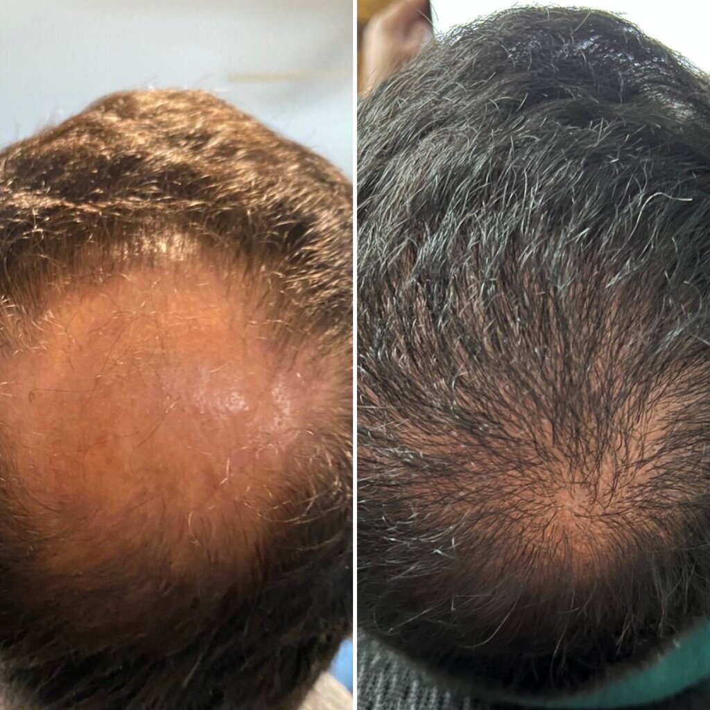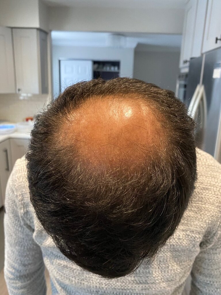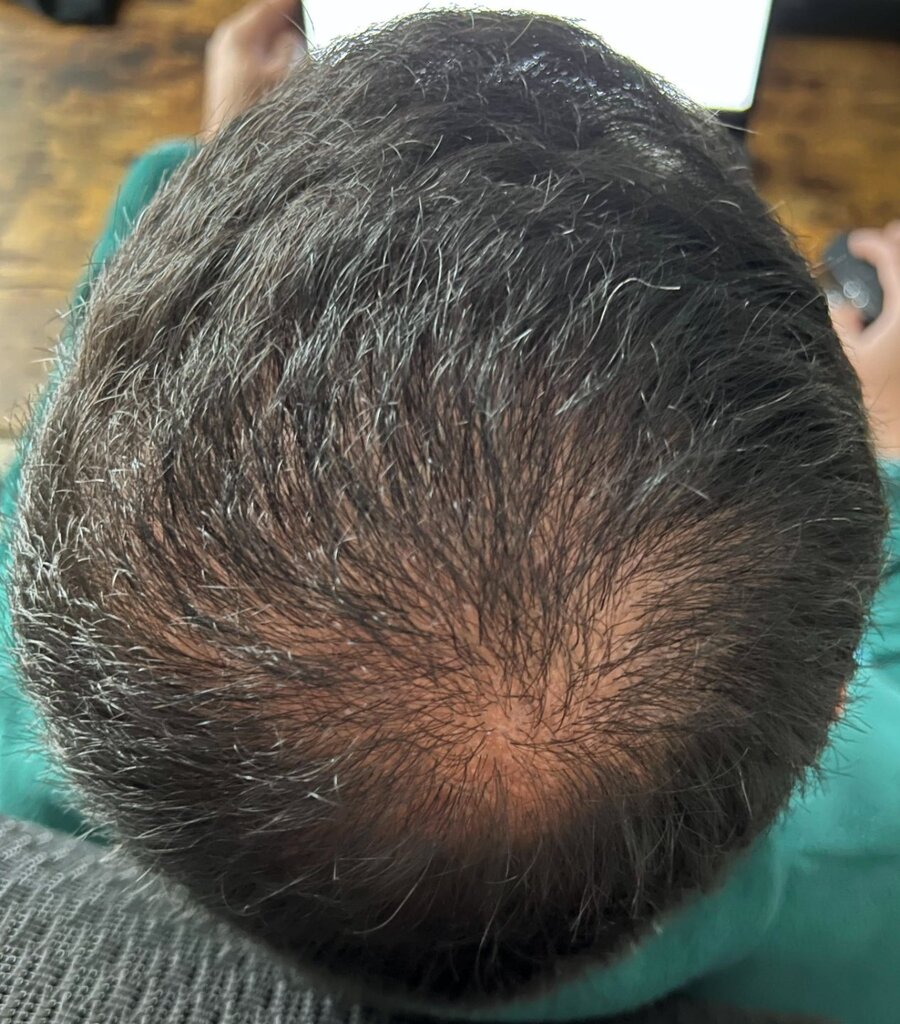 The two areas of hair loss are larger than in stage 4. They are still separated, but the band of hair between them is narrower and sparser. There is significant hair loss on the top of the scalp (the vertex).