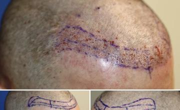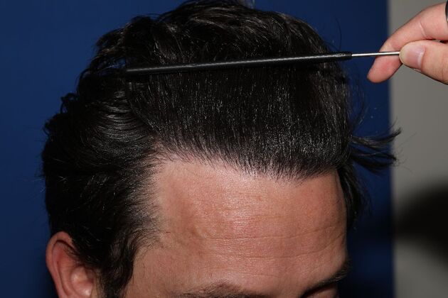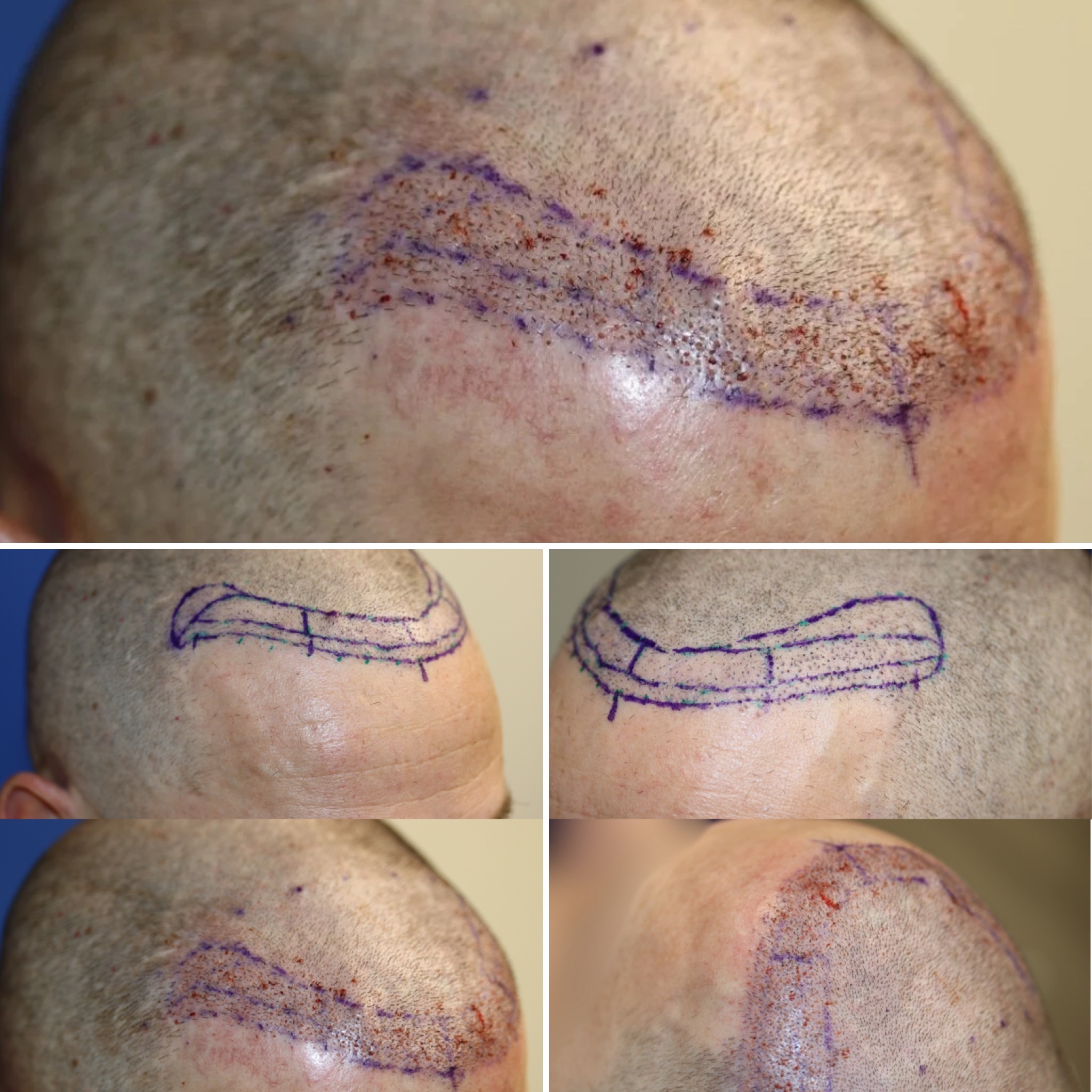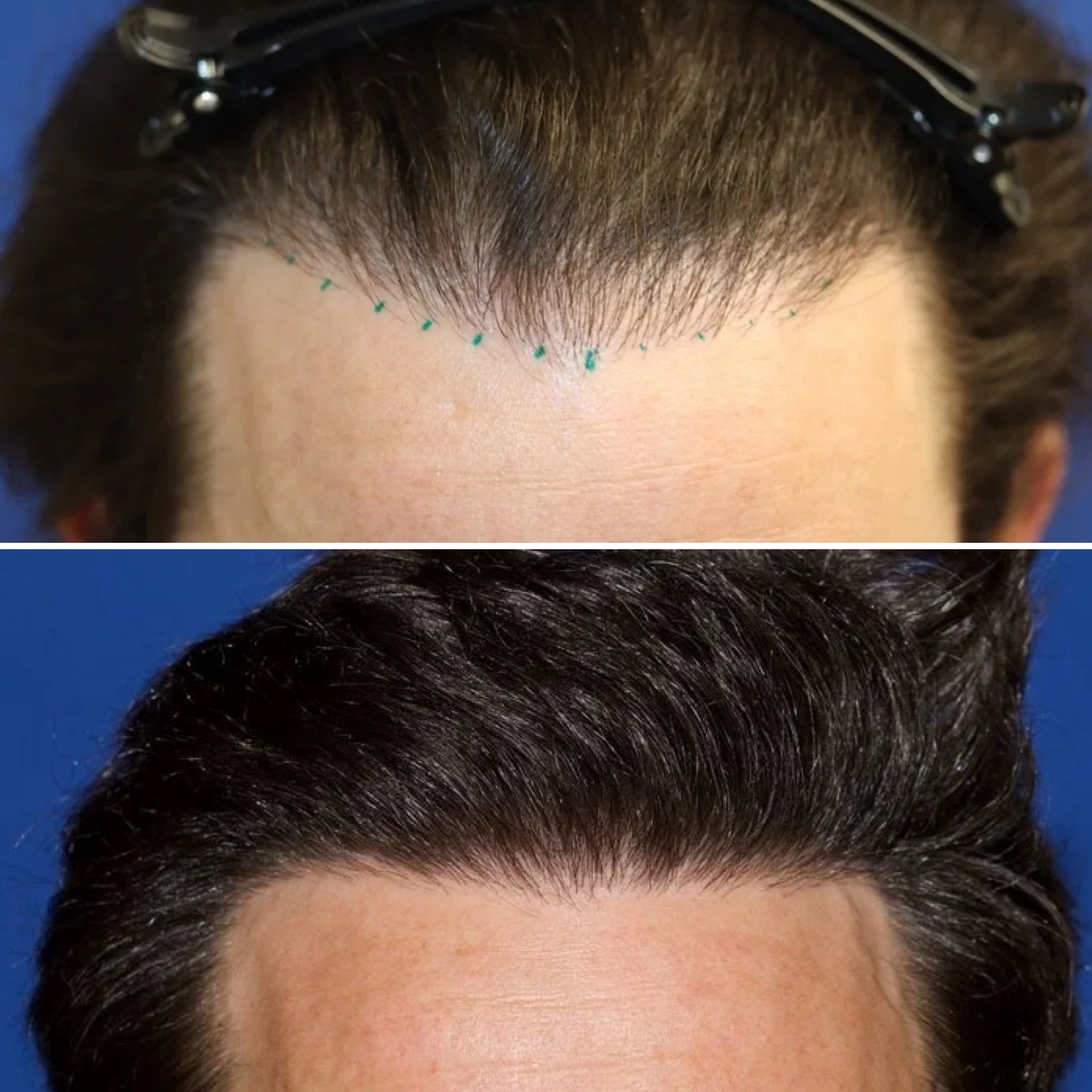 This is a repair case involving a patient who underwent an unauthorized hair transplant at another clinic. He was not satisfied with the density or the appearance. A total of 965 grafts were used to feather the hairline and provide more density.