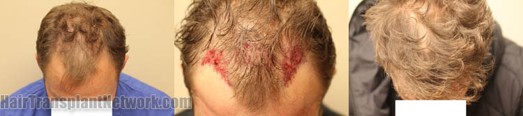 This was a patient who was noticing loss to the temple areas, as well as thinning of the frontal scalp. He wanted to thicken up these areas and we did a small FUE session to fill these in.He received 135 single grafts, 632 double grafts, and 79 three hair grafts, for a total count of 836 grafts. He has very well so far for a relatively small procedure. Attached are his before and after photos.