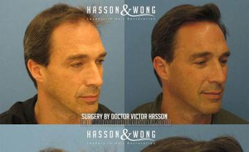 This Vancouver area patient came to see Dr. Hasson about his weak hairline and thinning crown. 4693 grafts were used to rebuild the hairline and frontal zone blending into his mid scalp and increasing the density of his crown. Some of the very center of the mid-scalp was not transplanted and medication was employed to hold the margins and possibly improve some of the existing hair. Of the 4693 Grafts, 1904 were singles, 2564 were doubles, 225 were 3-4 hair grafts. There are no immediately post-op pics, The last two photos are 2 weeks post-op, the others are 10 months post-op.