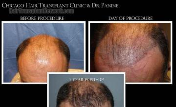 A total of 3,042 grafts were used. The break down was as follows: 1,401 single hair grafts, 1,245 two hair grafts and 396 three hair grafts. I used a significant amount of single hair follicular units which allowed me to create a very natural looking hairline. This action will allow him to comb his hair and style it however he chooses, without anyone detecting that he has had anything done. These are his results 1 year after his procedure. The patient is extremely happy with his result and is planning a second procedure to add more hair to the mid-scalp. I will update his album after his second procedure is completed.