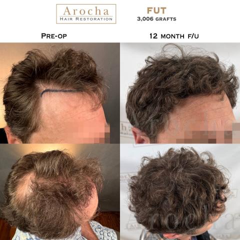Check out this 40-year-old's incredible transformation! After battling thinning at the hairline and crown, he underwent a 3,006 graft FUT with Dr. Arocha. The result? A full, natural look with amazing curls that blends perfectly with his natural hairline. The goal of any hair transplant is to look like you *haven't* had one, and this patient is proof of stunning, subtle results. Scroll to see his sleek, combed-back hairline in action!